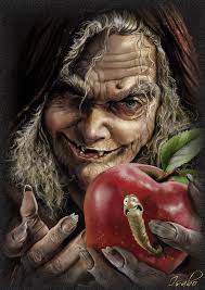 ELA ERA,VELHA,ENRUGADA,SEM OS DENTES,UNHAS PRETAS E TRAZIAUMA MAÇÃ NA MÃO,AI COMO CRIANÇA É UM SER INOCENTE,EU NEM COMIA MAÇÃ DE MEDO DA BRUXA VIR ME PEGAR.